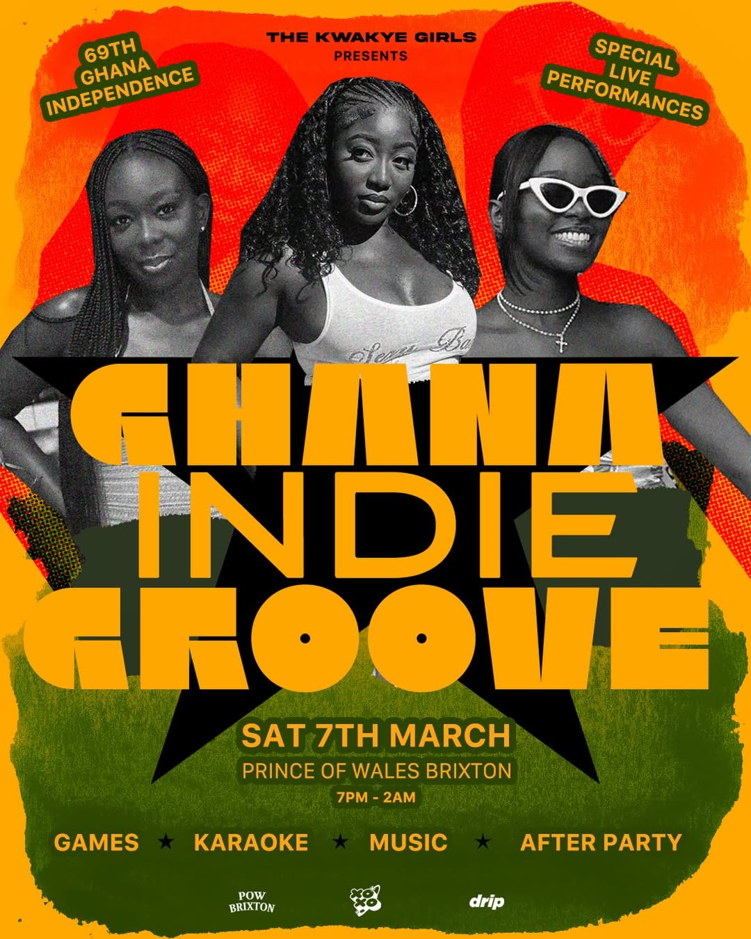 March 3, 2026The Kwakye Girls presents Ghana Groove. Br3nya, Hemah K, Amps. Celebrating Ghana 69th Independence Day. Games – Karaoke – Music – After Party. Pow Brixton 467-469 Brixton Rd, London SW9 8HH, UK. sáb, 7 mar 2026 – dom, 8 mar 2026 a las 19:00-2:00
