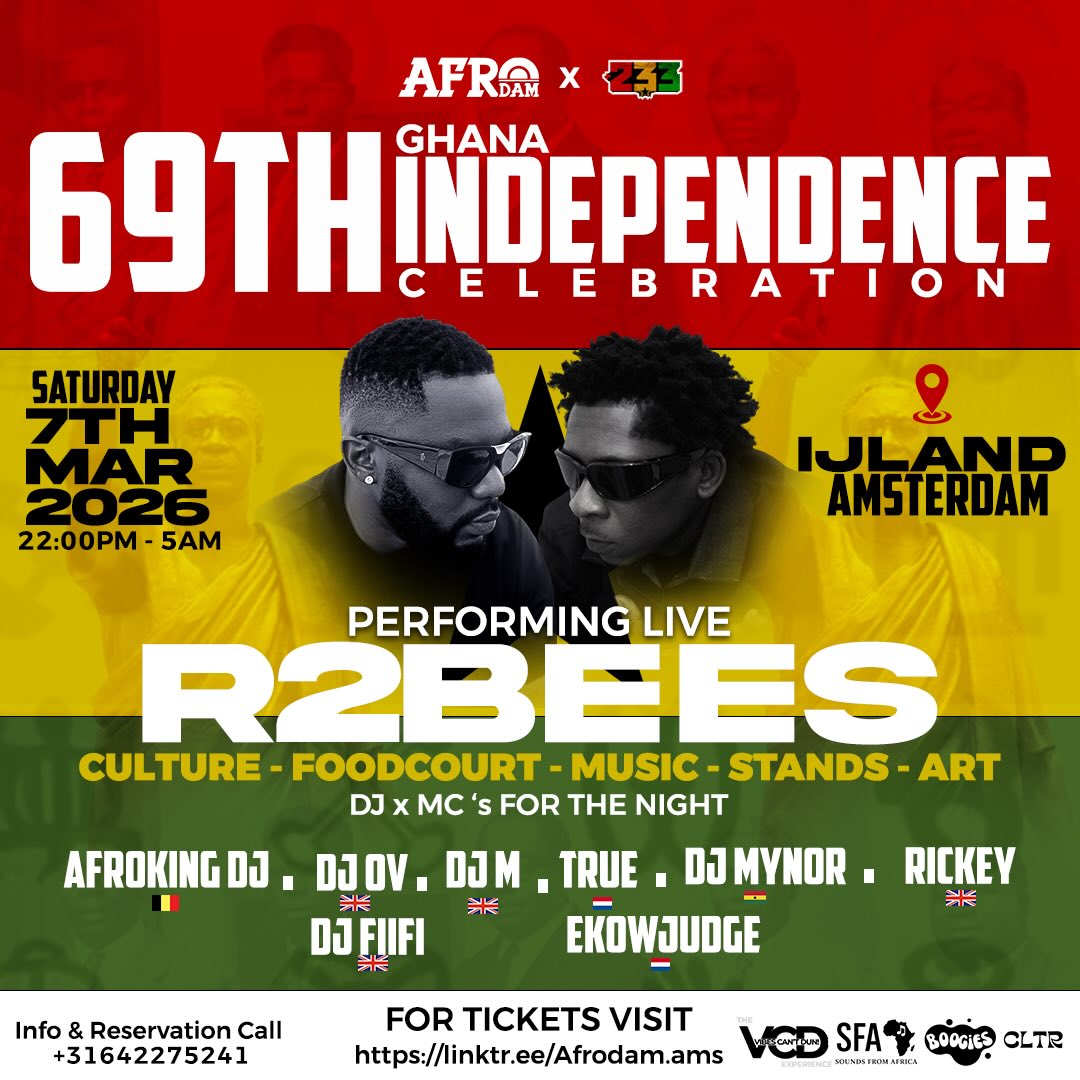 March 3, 2026Few days to turn Amsterdam down with our own UK 🇬🇧 Ghanaian dj’s and mc as we celebrate 69th Ghana independence celebration with the legends @r2beesmusic 🎉🎉🎉🇬🇭🇬🇭🇬🇭🇬🇭 Come celebrate Ghana’s Independence day with R2Bees live performance! Get ready for a night filled with incredible music, nostalgia, and good vibes.