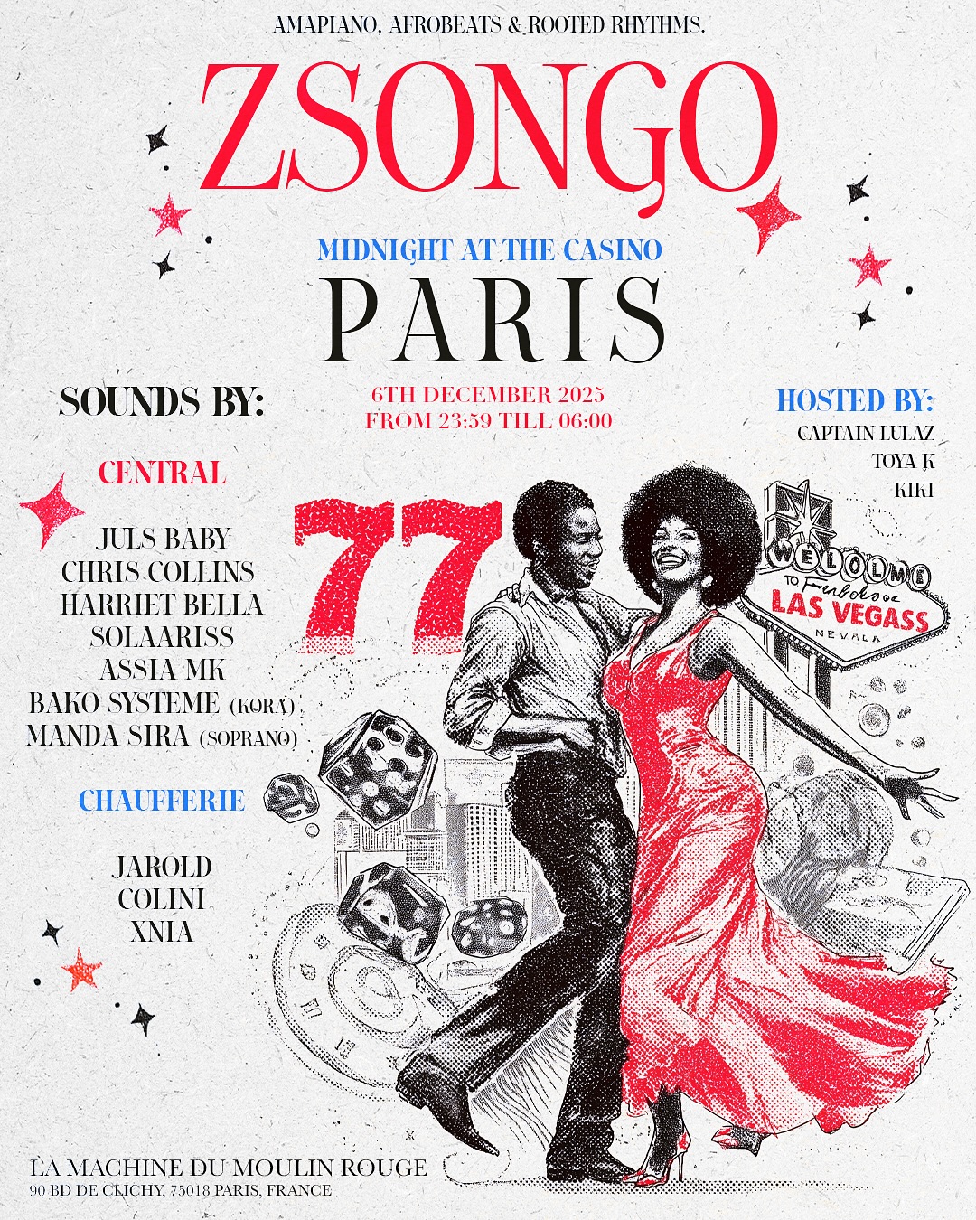 November 14, 2025This 6 DECEMBER 2025!!! ZSONGO IS BACK IN PARIS. AT LA MACHINE DU MOULIN ROUGE. This one is coming strong with JULS BABY, SOLAARISS, TOYA K, XNIA, COLINI, JAROLD, CAPTAIN LULAZ, KIKI, CHRIS COLLINS, MANDA SIRA, BAKO SYSTÈME, ASSIA MK & HARRIET BELLA.